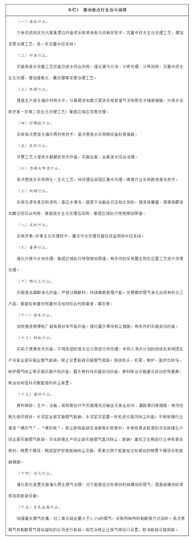 推動(dòng)治污減排工程建設(shè)。各省(區(qū)、市)要制定實(shí)施造紙、印染等十大重點(diǎn)涉水行業(yè)專項(xiàng)治理方案,大幅降低污染物排放強(qiáng)度。電力、鋼鐵、紡織、造紙、石油石化、化工、食品發(fā)酵等高耗水行業(yè)達(dá)到先進(jìn)定額標(biāo)準(zhǔn)。以燃煤電廠超低排放改造為重點(diǎn),對(duì)電力、鋼鐵、建材、石化、有色金屬等重點(diǎn)行業(yè),實(shí)施綜合治理,對(duì)二氧化硫、氮氧化物、煙粉塵以及重金屬等多污染物實(shí)施協(xié)同控制。各省(區(qū)、市)應(yīng)于2017年底前制定專項(xiàng)治理方案并向社會(huì)公開(kāi),對(duì)治理不到位的工程項(xiàng)目要公開(kāi)曝光。制定分行業(yè)治污技術(shù)政策,培育示范企業(yè)和示范工程。