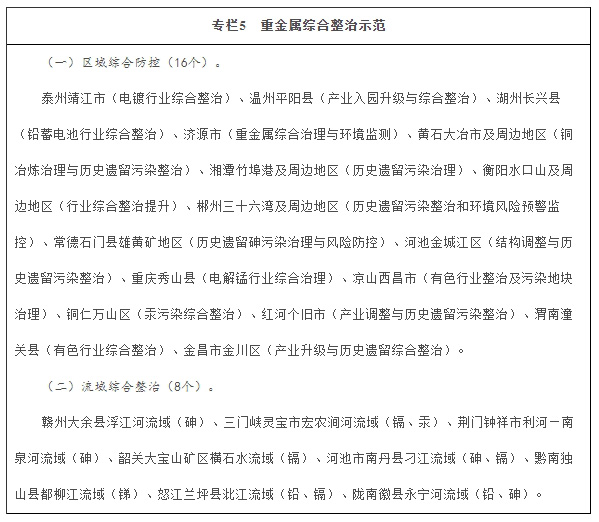 深化重點(diǎn)區(qū)域分類防控。重金屬污染防控重點(diǎn)區(qū)域制定實(shí)施重金屬污染綜合防治規(guī)劃,有效防控環(huán)境風(fēng)險(xiǎn)和改善區(qū)域環(huán)境質(zhì)量,分區(qū)指導(dǎo)、一區(qū)一策,實(shí)施差別化防控管理,加快湘江等流域、區(qū)域突出問(wèn)題綜合整治,“十三五”期間,爭(zhēng)取20個(gè)左右地區(qū)退出重點(diǎn)區(qū)域。在江蘇靖江市、浙江平陽(yáng)縣等16個(gè)重點(diǎn)區(qū)域和江西大余縣浮江河流域等8個(gè)流域開(kāi)展重金屬污染綜合整治示范,探索建立區(qū)域和流域重金屬污染治理與風(fēng)險(xiǎn)防控的技術(shù)和管理體系。建立“錳三角”(錳礦開(kāi)采和生產(chǎn)過(guò)程中存在嚴(yán)重環(huán)境污染問(wèn)題的重慶市秀山縣、湖南省花垣縣、貴州省松桃縣三個(gè)縣)綜合防控協(xié)調(diào)機(jī)制,統(tǒng)一制定綜合整治規(guī)劃。優(yōu)化調(diào)整重點(diǎn)區(qū)域環(huán)境質(zhì)量監(jiān)測(cè)點(diǎn)位,2018年底前建成全國(guó)重金屬環(huán)境監(jiān)測(cè)體系。