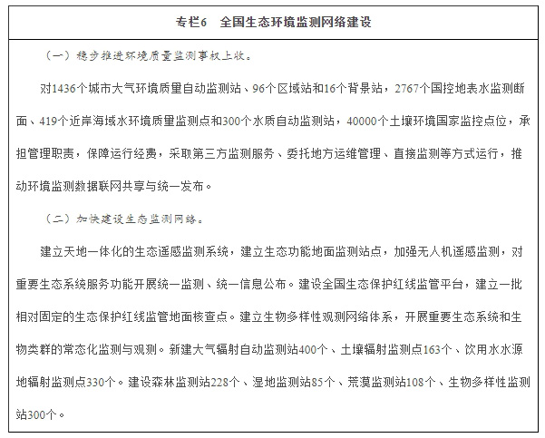 加強(qiáng)生態(tài)環(huán)境監(jiān)測(cè)網(wǎng)絡(luò)建設(shè)。統(tǒng)一規(guī)劃、優(yōu)化環(huán)境質(zhì)量監(jiān)測(cè)點(diǎn)位,建設(shè)涵蓋大氣、水、土壤、噪聲、輻射等要素,布局合理、功能完善的全國(guó)環(huán)境質(zhì)量監(jiān)測(cè)網(wǎng)絡(luò),實(shí)現(xiàn)生態(tài)環(huán)境監(jiān)測(cè)信息集成共享。大氣、地表水環(huán)境質(zhì)量監(jiān)測(cè)點(diǎn)位總體覆蓋80%左右的區(qū)縣,人口密集的區(qū)縣實(shí)現(xiàn)全覆蓋,土壤環(huán)境質(zhì)量監(jiān)測(cè)點(diǎn)位實(shí)現(xiàn)全覆蓋。提高大氣環(huán)境質(zhì)量預(yù)報(bào)和污染預(yù)警水平,強(qiáng)化污染源追蹤與解析,地級(jí)及以上城市開(kāi)展大氣環(huán)境質(zhì)量預(yù)報(bào)。建設(shè)國(guó)家水質(zhì)監(jiān)測(cè)預(yù)警平臺(tái)。加強(qiáng)飲用水水源和土壤中持久性、生物富集性以及對(duì)人體健康危害大的污染物監(jiān)測(cè)。加強(qiáng)重點(diǎn)流域城鎮(zhèn)集中式飲用水水源水質(zhì)、水體放射性監(jiān)測(cè)和預(yù)警。建立天地一體化的生態(tài)遙感監(jiān)測(cè)系統(tǒng),實(shí)現(xiàn)環(huán)境衛(wèi)星組網(wǎng)運(yùn)行,加強(qiáng)無(wú)人機(jī)遙感監(jiān)測(cè)和地面生態(tài)監(jiān)測(cè)。構(gòu)建生物多樣性觀測(cè)網(wǎng)絡(luò)。